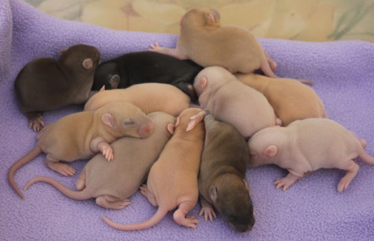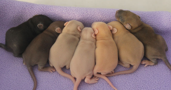 19/02/23: 9 days old, the litter palette: black, chocolate, self brown chestnut, dilute champagne, dilute silver fawn, brown chestnut, agouti